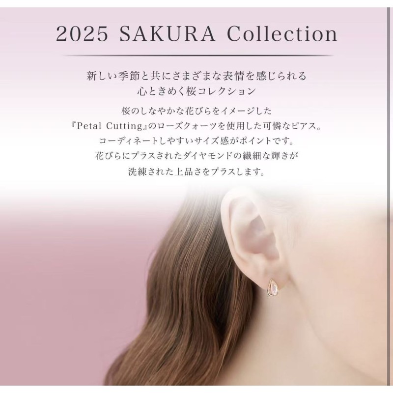新しい季節と共にさまざまな表情を感じられる心ときめく桜コレクション桜のしなやかな花びらをイメージした『Petal Cutting』のローズクォーツを使用した可憐なピアス。コーディネートしやすいサイズ感がポイントです。淡いピンクカラーのローズクォーツは『美・愛・優しさ』を意味し、身に着けるひとに愛をもたらし美しさと優しさを印象付けます。花びらにプラスされたダイヤモンドの繊細な輝きが洗練された上品さをプラスします。Petal Cutting…桜の花びらを思わせる繊細なシェイプが可憐さを際立たせるオリジナルカット。花びらのやわらかな曲線をローズクォーツのしなやかなフォルムで表現しました。※天然石を使用しているため、実際の色味や風合いが異なる場合がございます。[限定ケース付]